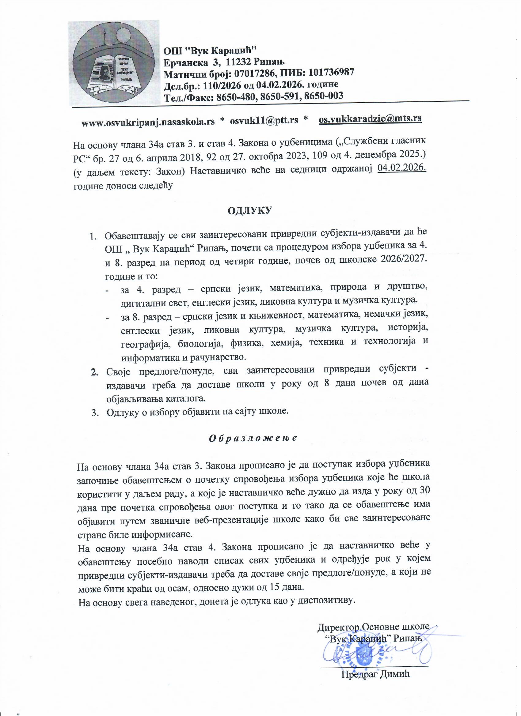 Избор уџбеникаДатум: 10. Februar 2026 18:28 Категорија: НовостиОбавештавају се заинтересовани привредни субјекти - издавачи да ће ОШ "Вук Караџић" Рипањ почети са процедуром избора уџбеника за четврти и осми разред на период од четири године, почев од школске 2026/27. године ![]() |